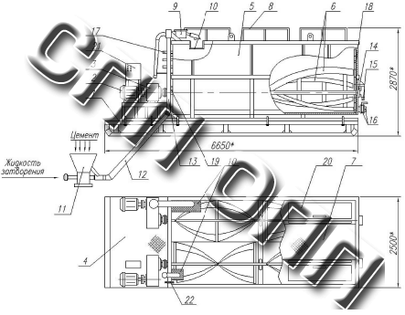1 — сани; 2 — электродвигатель; 3 — редуктор; 4 — переходная площадка обслуживания; 5 — резервуар; б — мешалка четырехлопастная с противоположно направленными витками; 7 — площадка обслуживания верхняя; 8 — ограждение перильное; 9 — гидропневматический смеситель; 10 — сетка-корзина; 11 — гидронапорный смеситель с воронкой; 12 — рукав напорный; 13 — трубопровод наливной; 14 — подшипник; 15 — тавотница; 16 — приемное устройство с заслонкой поворотной; 17 — лестница; 18 — мерная линейка; 19 — устройство сальниковое; 20 — крышка откидная; 21 — пульт управления; 22- поплавковый уровнемер